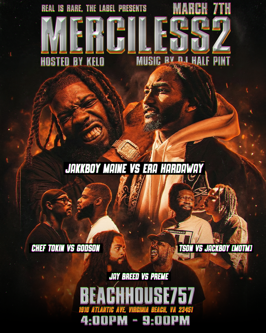 The upcoming Merciless 2 rap battle event, presented by Real Is Rare, The Label, is set to light up the Virginia scene on Saturday, March 7, 2026, at Beach House 757 in the Hampton Roads area (likely Norfolk/Virginia Beach vicinity, tying into the 757 roots).